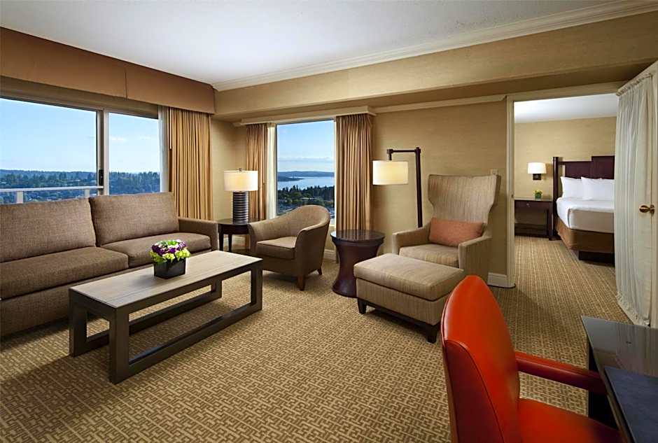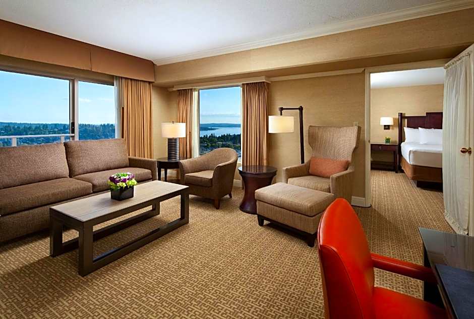 A separate seating area and sofa bed are available in this corner suite. Free toiletries are provided. Views of either Bellevue, Lake Washington, or Mount Rainier are featured.