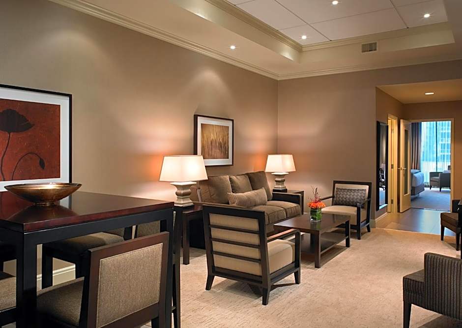 This spacious suite features a separate living area with a sofa bed and dining table.